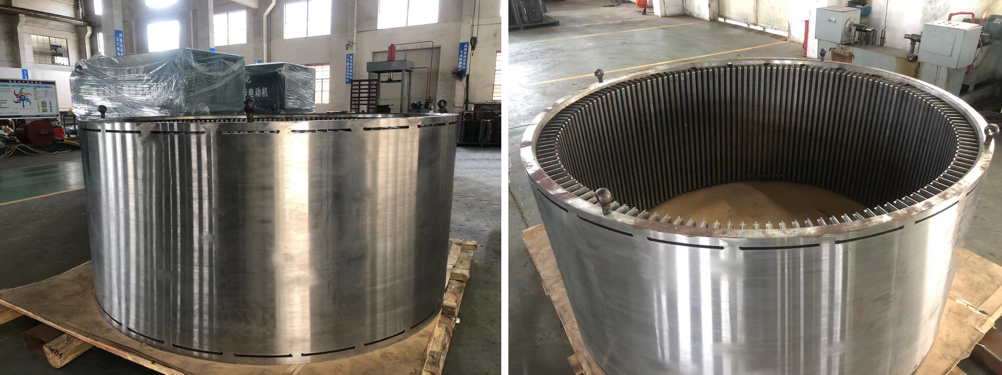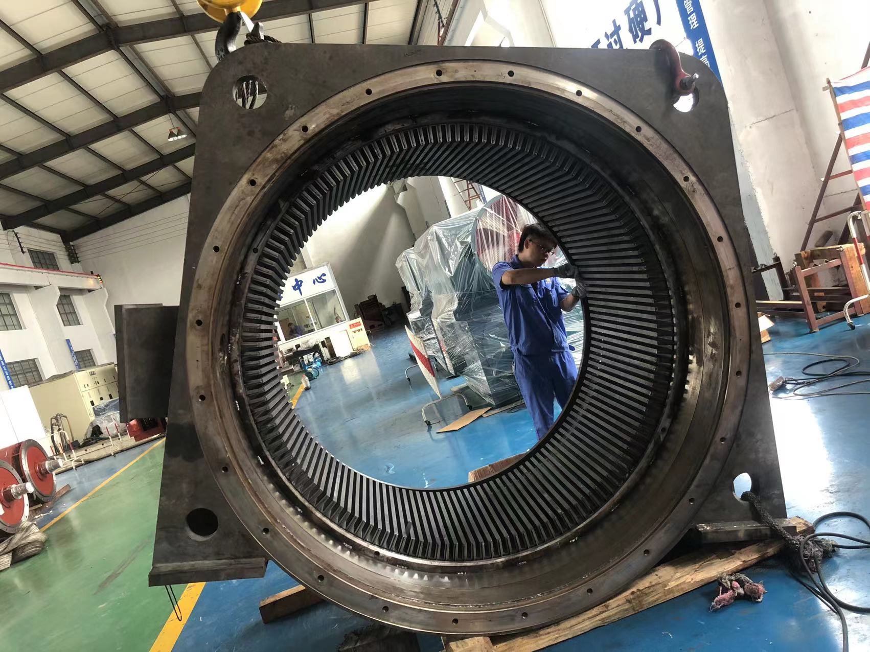 在金工车间里,TYCFB-1600-40-1600KW 10KV电机定子等待,定子外观光洁发亮格外显眼。